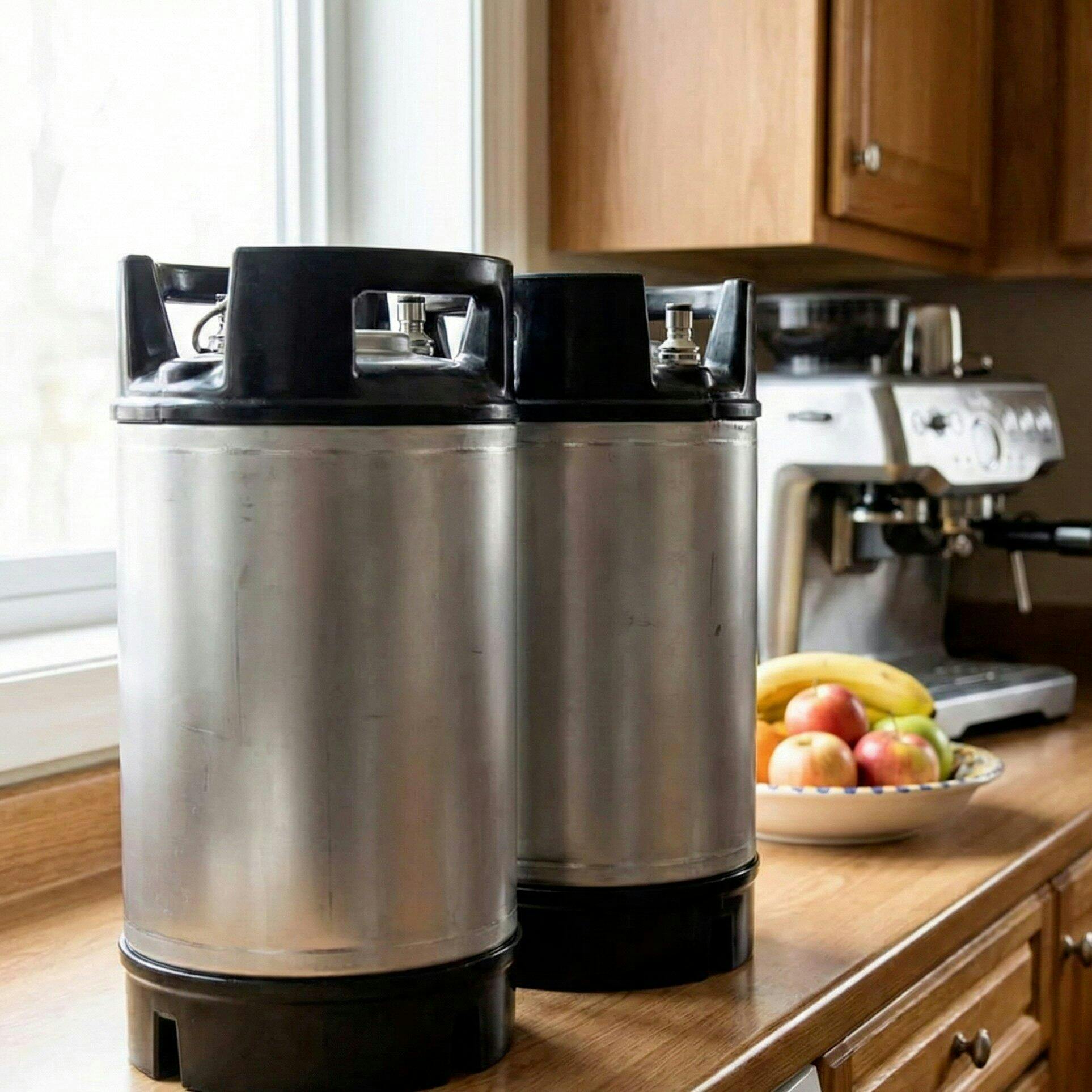 - Funksjonalitet: Utstyrt med standard Ball Lock-koblinger (Cornelius-standard), som gjør det lekende lett å koble til CO2 og tappekran. De vulkaniserte gummiringene i topp og bunn fungerer som støtdempere, gir et ergonomisk grep og gjør fatet stabilt og enkelt å stable.